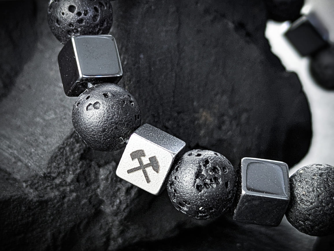 POTTARMBAND Kollektion "Glück auf" mit dem im Ruhrgebiet beliebten Bergmannssymbol "Schlägel & Eisen". Wir bieten Dir unterschiedliche Armband Varianten mit Edelstein- und Lavaperlen sowie aus Leder oder Segeltau. Glück auf!